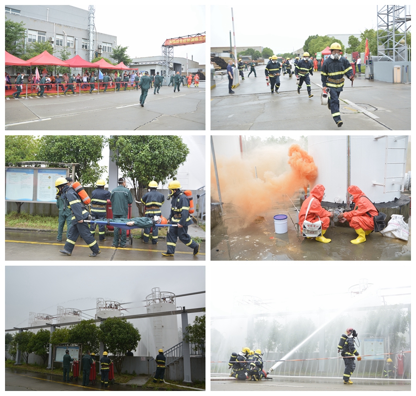 此次演练预设场景为海隆厂区甲类液体储罐管道发生泄露,由于抢修不慎造成火灾,火势逐渐扩大、失去控制,同时有人员受伤,应急预案随之展开。疏散警戒组、物资保障组、通信联络组、设备保障组、环境侦检组依次到??;消防和医疗人员展开灭火、被困人员解救和伤员救治工作,同步组织实施堵漏。由于现场火势逐渐增强,消防扑救组请求政府救援力量处置,随后宝山区110、119加大力量赶赴现场救援,共同将火势控制下来。整个演练时间约15分钟,演练流程顺畅,环节紧凑,各小组表现优异,圆满完成了各项演练任务。