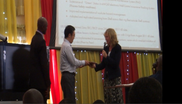 海隆油服尼日利亚项目组建伊始,就严格执行总部和甲方制定的各项HSE政策和规章制度、并结合自身实际制定系列HSSE管理措施,在人员安全、环境?;さ确矫娑既〉昧肆己玫某杉?。尼日利亚项目现有HL-2、HL-19两部2000HP钻机,自开钻以来,LTI为零,全年无任何人员伤亡事件。鉴于以上HSSE工作的优秀表现,海隆油服尼日利亚项目公司受邀参加此次HSSE论坛会,项目总经理陈聚庆在会上做了HSSE工作介绍,并接受了颁发的奖牌。海隆也是在SPDC五十多个承包商中,少数几家在会上发言并获奖牌的承包商之一。
