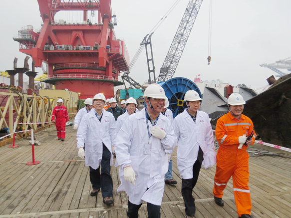 (2015年3月18日,上海)2015年3月15日,中国海洋石油总公司(下称“中海油”) 副总经理武广齐、中海油有限公司高级副总裁兼海油上海局局长张国华等高层及专家莅临海隆,视察海隆集团为中海油东海海底管道铺设项目的准备情况。