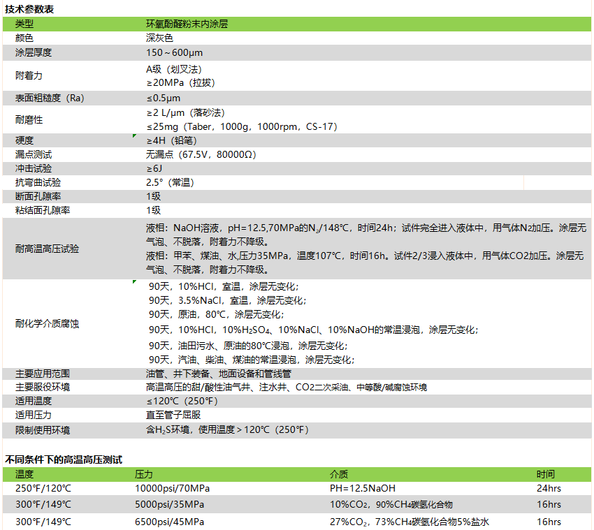 ·具有优异的耐磨性、附着力和柔韧性; ·适用于含CO2、油、水、盐水和中等酸/碱腐蚀环境; · 表面光滑和具有高光泽,提高流体效率。