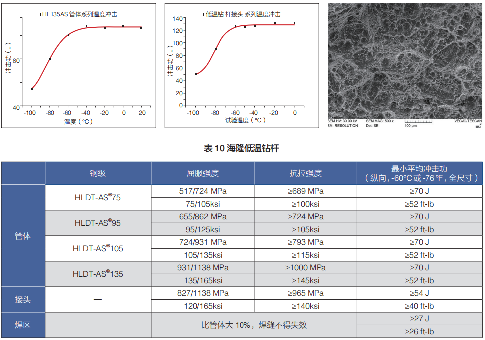 和普通钻杆相比,该产品具有更好的低温韧性,包括更高的冲击功和更低的韧脆转变温度,具有更优的抗脆断能力。如在常温使用,具有比普通钻杆更高的抗断裂和疲劳能力,使用寿命可显著提高。