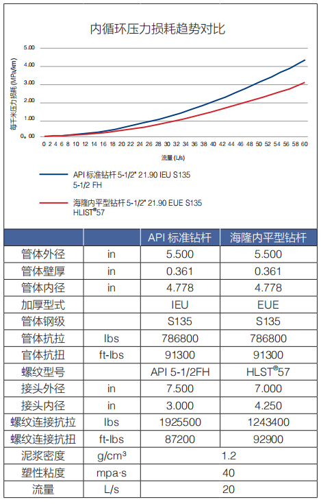 下面以 5 1/2" 21.9lb/ft S135 钻杆为例给出内平型钻杆与普通 API 钻杆的比较: