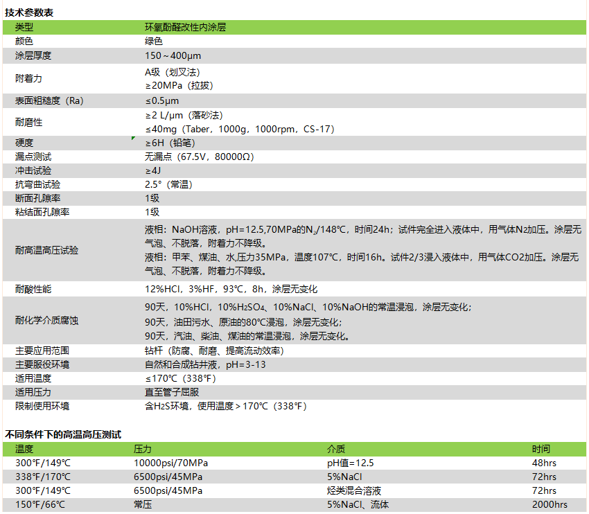 ·具有优异的防腐蚀性能,有效防止点蚀,可应用于各种泥浆体系; ·具有优异的耐磨性能,优异的抗机械性能,重复使用也能保持涂层完好; ·能有效提高流动性,降低泵压及减轻磨损。