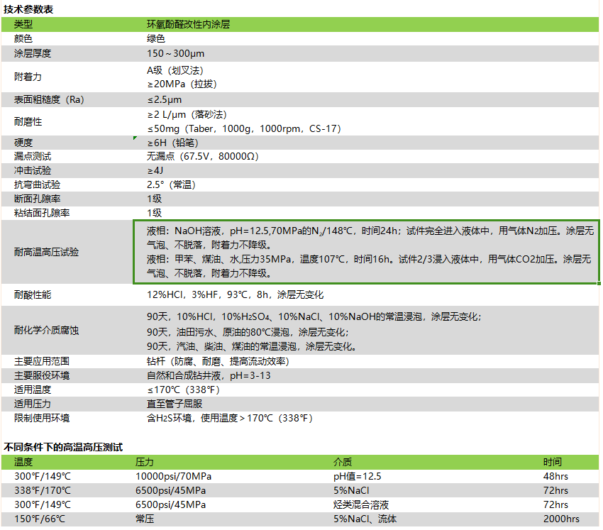 · 具有优异的防腐蚀性能,有效防止点蚀,可应用于各种泥浆体系; ·具有优异的耐磨性能,优异的抗机械性能,重复使用也能保持涂层完好; ·能有效提高流动性,降低泵压及减轻磨损。