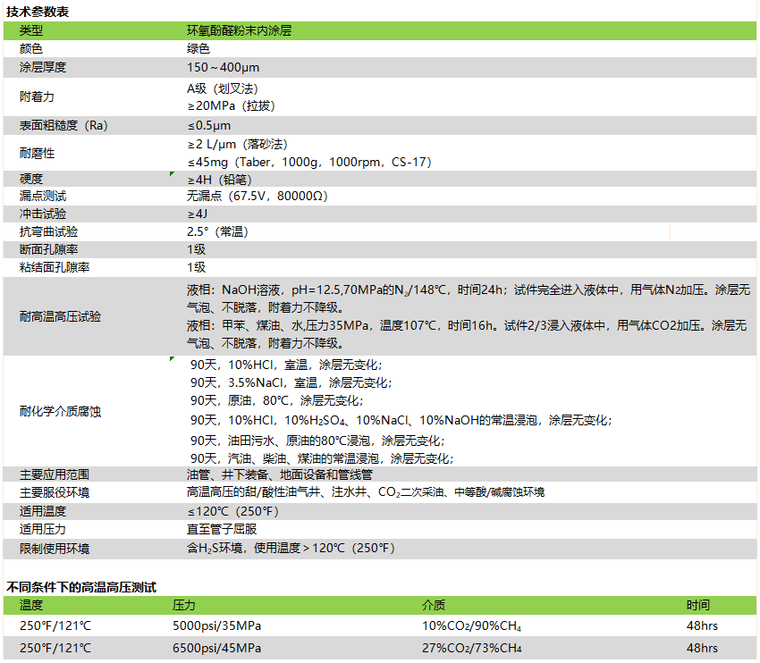 ·具有优异的附着力和柔韧性; ·适用于含CO2、油、水、盐水和中等酸/碱腐蚀环境; ·表面光滑和具有高光泽,提高流体效率。