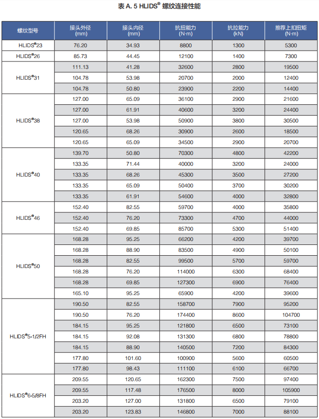 (a)HLIDS® 系列包括 HLIDS®23、HLIDS®26、HLIDS®31、HLIDS®38、HLIDS®40、HLIDS®46、HLIDS®50、HLIDS®5 1/2FH 和 HLIDS®6 5/8FH 等规格,适用于 2 3/8"-6 5/8" 所有API 标准钢级和规格的钻杆。